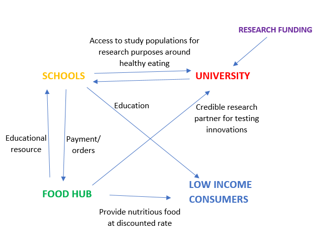 The workshop lasted all day (with a break for a delicious vegan lunch). It began with brainstorming using post-it notes on ‘value explorers’. Participants then broke into groups featuring a range of organisations and mapped out how they imagined the Good Food For All project would work, before presenting their ideas. Key ideas included ‘Education’, ‘NHS Vouchers’, ‘Procurement’ and ‘Research Potential’. Diagrams were created highlighting the potential for value exchange between different organisations, an example of which can be seen below.
