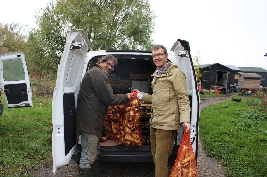 It gets even better. We’re all about efficiency and making the best use of our vans being out on the road. At the same time as we drop off the coffee grounds for composting, we collect fabulous organic veg for the Cambridge Organic Food Company, which goes out to households and wholesale customers.