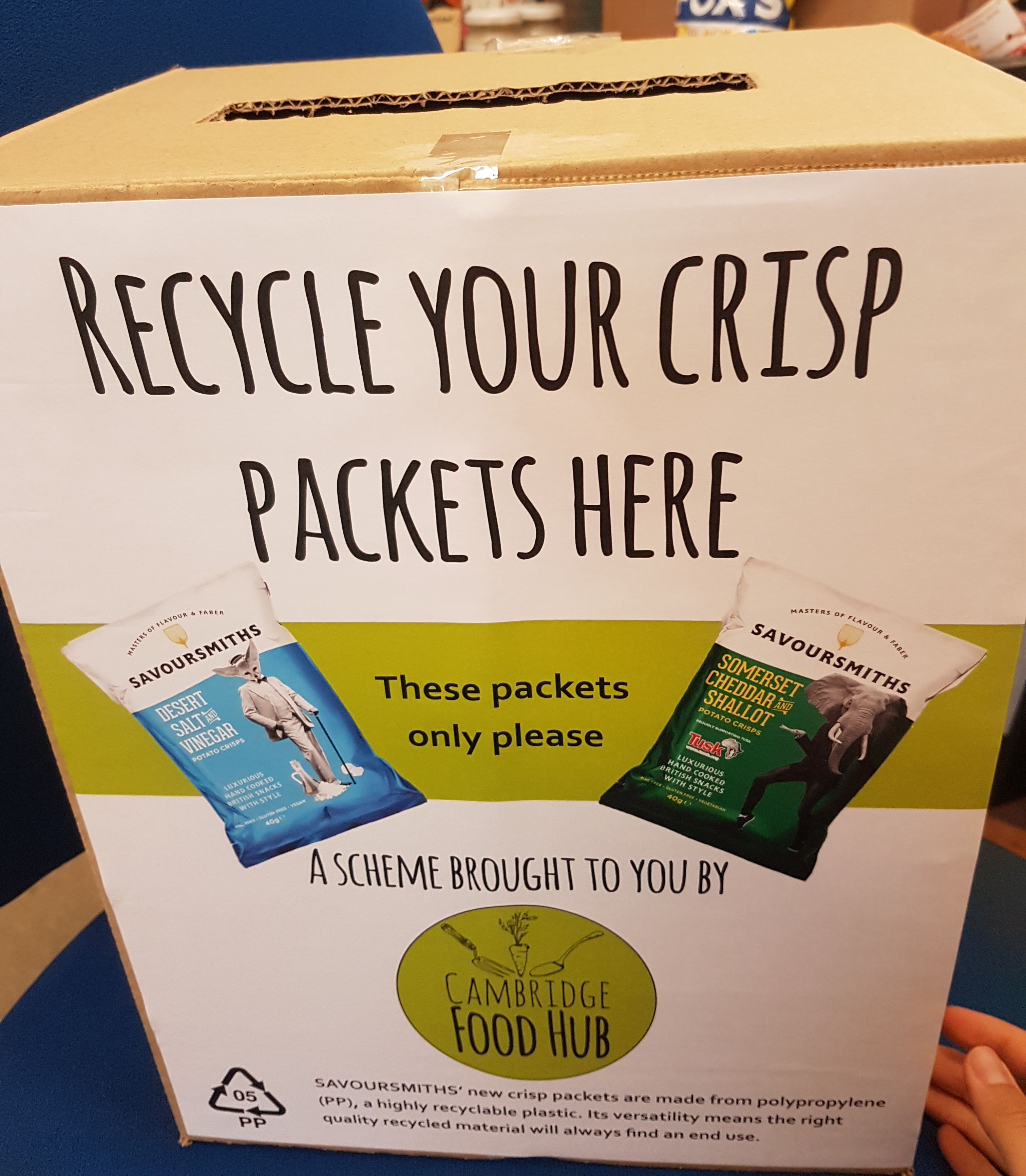 The brand of crisps that we are recycling is Savoursmiths. Based in Duxford, and using potatoes grown on their farm, they are the most local crisp brand for establishments in Cambridge and South Cambridgeshire. Their two new crisp flavours – Desert Salt and Vinegar and Somerset Cheddar and Shallot – come in Code 5 recyclable packaging. This makes it much easier to recycle than the mixed packaging of most crisp packets.